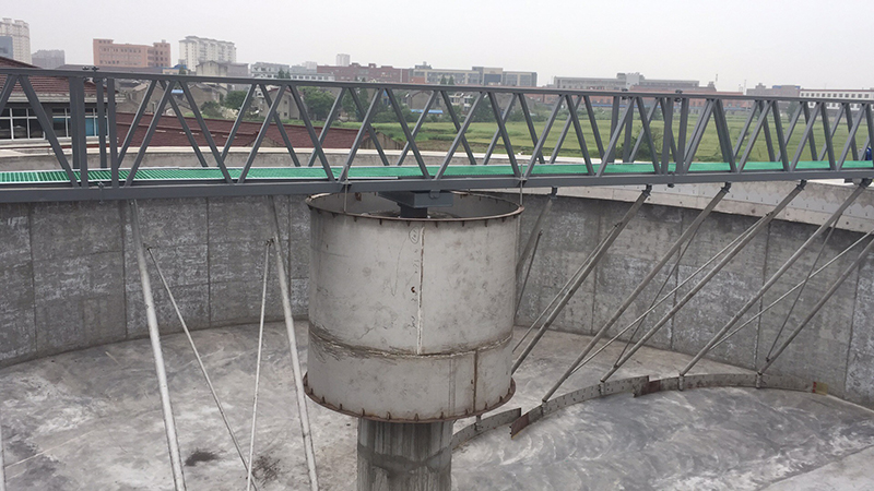 工作橋由安裝在周邊的驅(qū)動機(jī)構(gòu)帶動,繞安裝在池中心支墩上的中心支座旋轉(zhuǎn)。懸掛在工作橋下的掛臂拖動刮泥板旋轉(zhuǎn),沉淀在池底的污泥由刮泥板收集至中央集泥坑。液面上的浮渣在浮渣刮板和周邊擋渣板形成的漸縮區(qū)域內(nèi)集中,由浮渣刮板刮至集渣斗,排出池外。